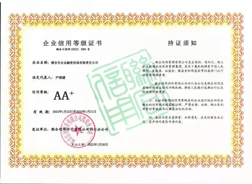 聯(lián)合信用評價(jià)有限公司是我國信用行業(yè)資質(zhì)最全、服務(wù)區(qū)域最廣,覆蓋規(guī)模最大的信用信息服務(wù)機(jī)構(gòu)之一。近期,該公司先后為四川省信用再擔(dān)保有限公司、成都市現(xiàn)代農(nóng)業(yè)融資擔(dān)保有限公司、瀘州市興瀘融資擔(dān)保集團(tuán)有限公司、眉山市眉州融資擔(dān)保有限公司等20余家川內(nèi)擔(dān)保機(jī)構(gòu)開展2022年度評級工作,共評出了兩家AA+擔(dān)保機(jī)構(gòu),其中就有雅安市擔(dān)保公司。